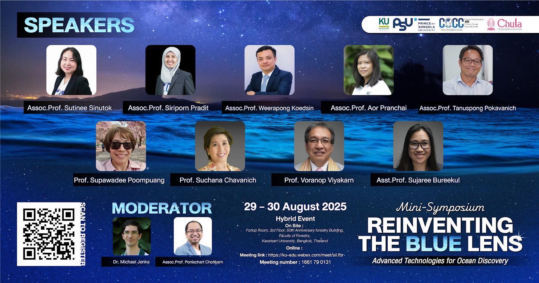 On 29–30 August 2025, the Coastal Oceanography and Climate Change Research Center (COCC) organized a mini-symposium titled “Reinventing the Blue Lens: Advanced Technologies for Ocean Discovery” at the Faculty of Forestry, Kasetsart University, Bangkok. The event was led by Assoc. Prof. Dr. Ponlachart Chotikarn, Assoc. Prof. Dr. Sutinee Sinutok, and Assoc. Prof. Dr. Siriporn Pradit.